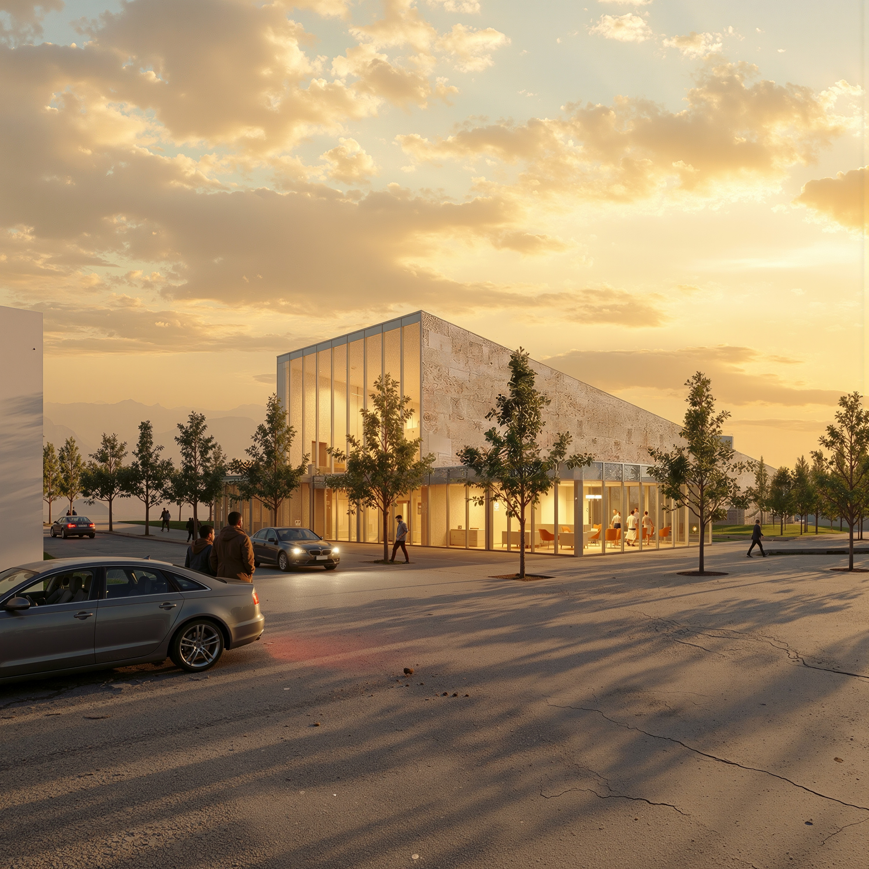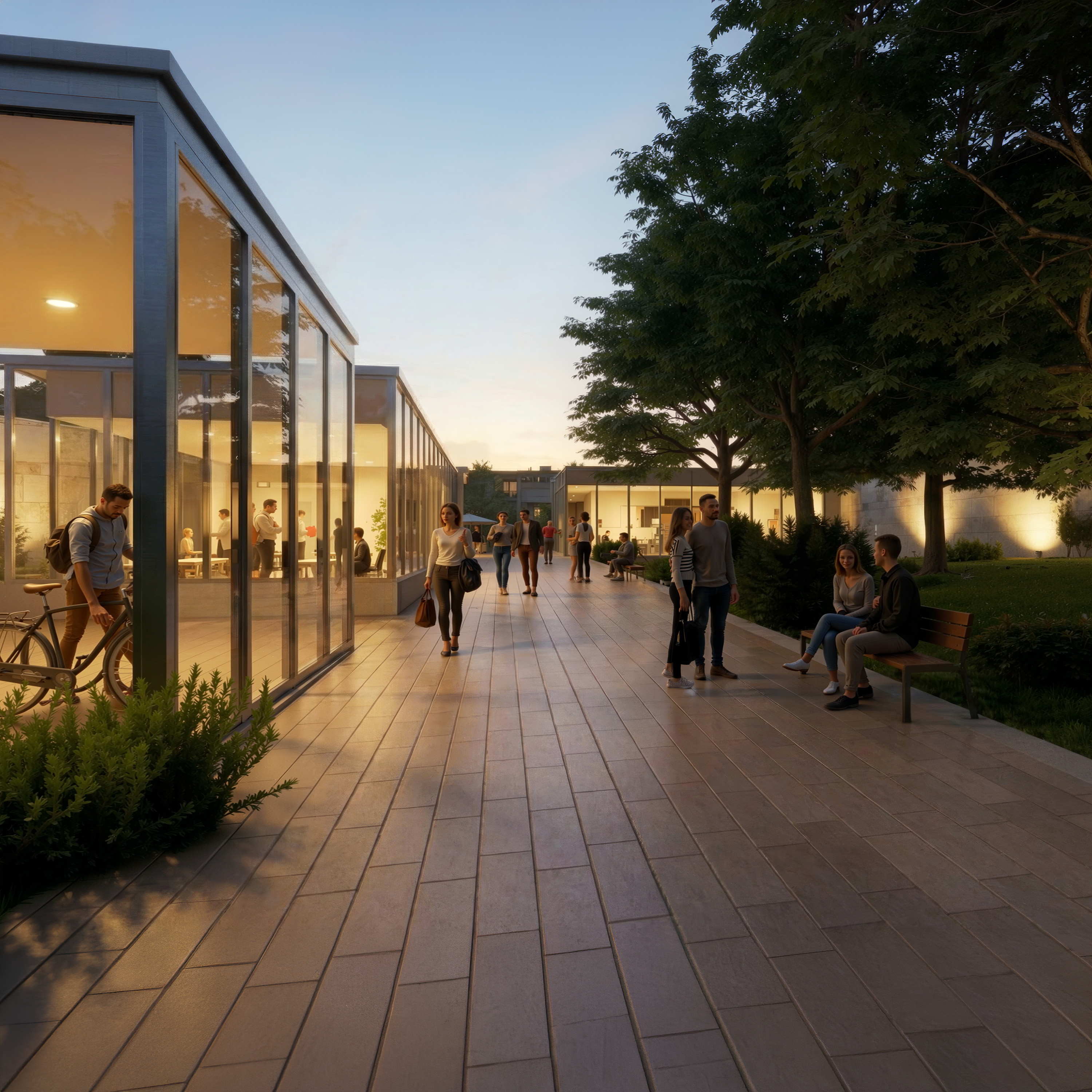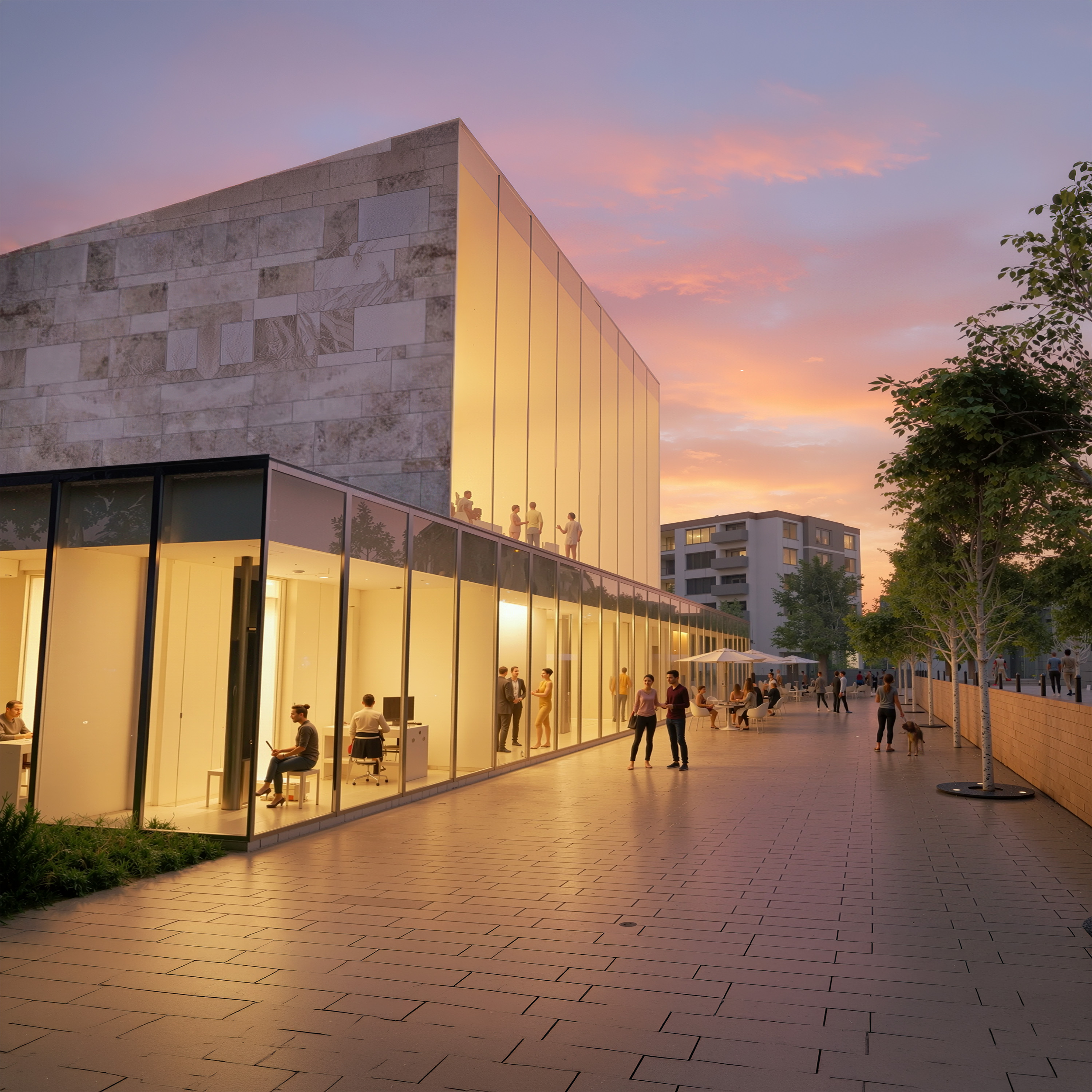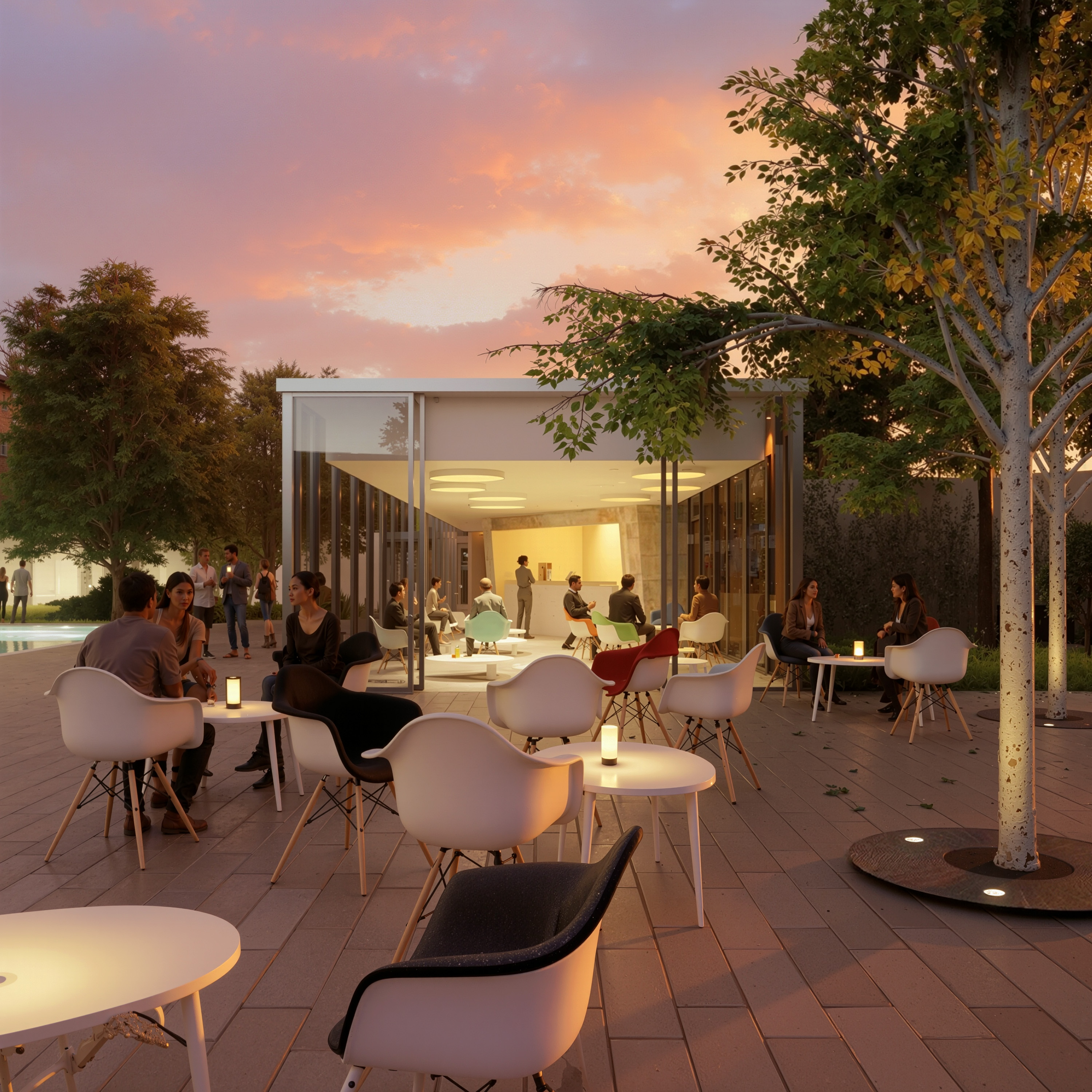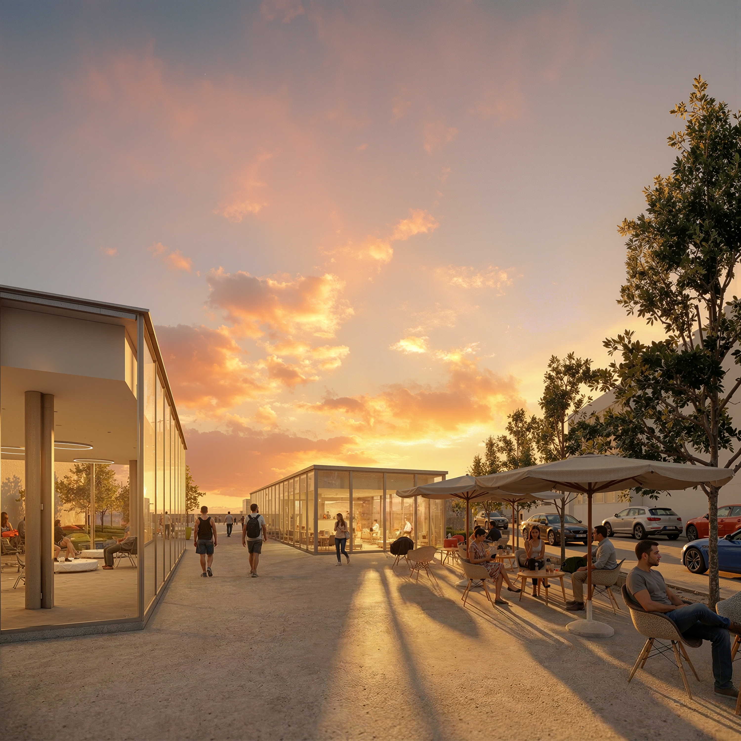 Deuxième entité du projet, le café culturel associe un bar-restaurant à un espace d’exposition dédié à l’art et prolonge la dynamique engagée sur le site. Il reprend les mêmes codes architecturaux afin d’affirmer une unité d’ensemble et de constituer un lieu identifiable presque autonome au sein du quartier. Les volumes cadrent les perspectives et ferment la vue sur trois côtés, n’ouvrant le regard que vers le campus Artem et, au loin, vers les toits de Nancy.