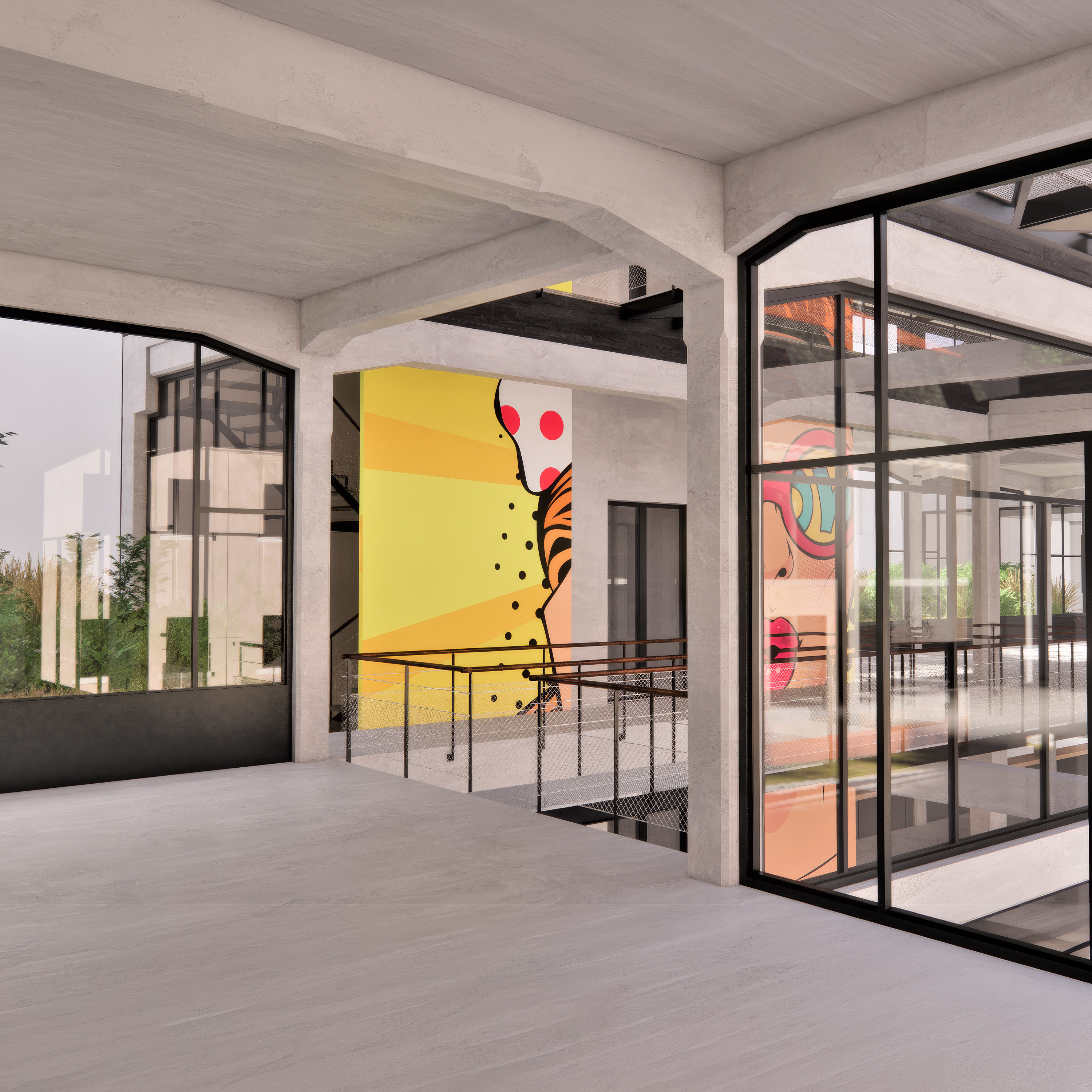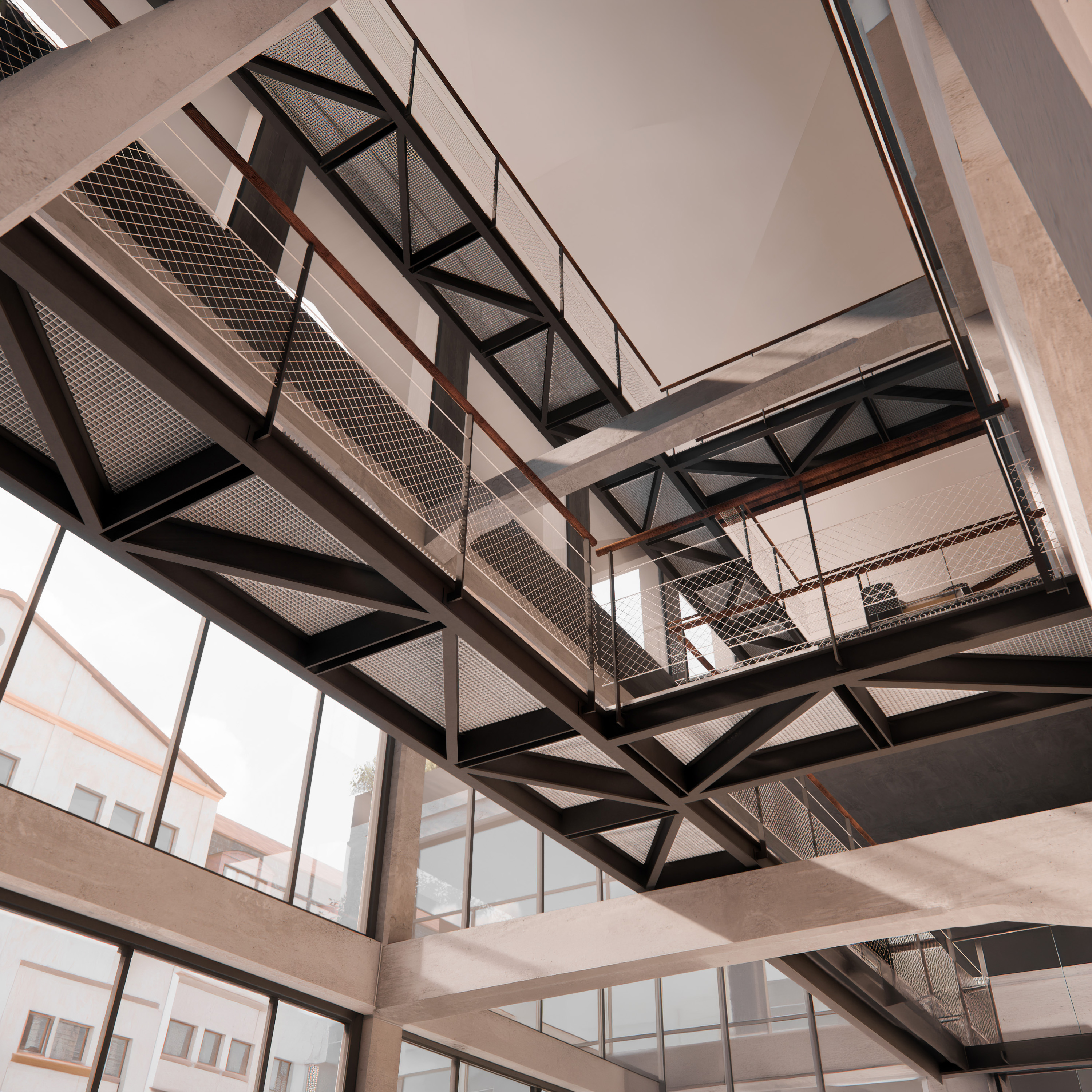 La structure béton du bâtiment, surdimensionnée par rapport à son usage premier en tant qu'abattoir, a constitué le point de départ du projet. En la mettant complètement à nu et en supprimant une partie de celle-ci afin d'ouvrir un atrium intérieur et extérieur, le projet met l'accent sur la mise en valeur du passé du bâtiment et le patrimoine industriel qu'il incarne.