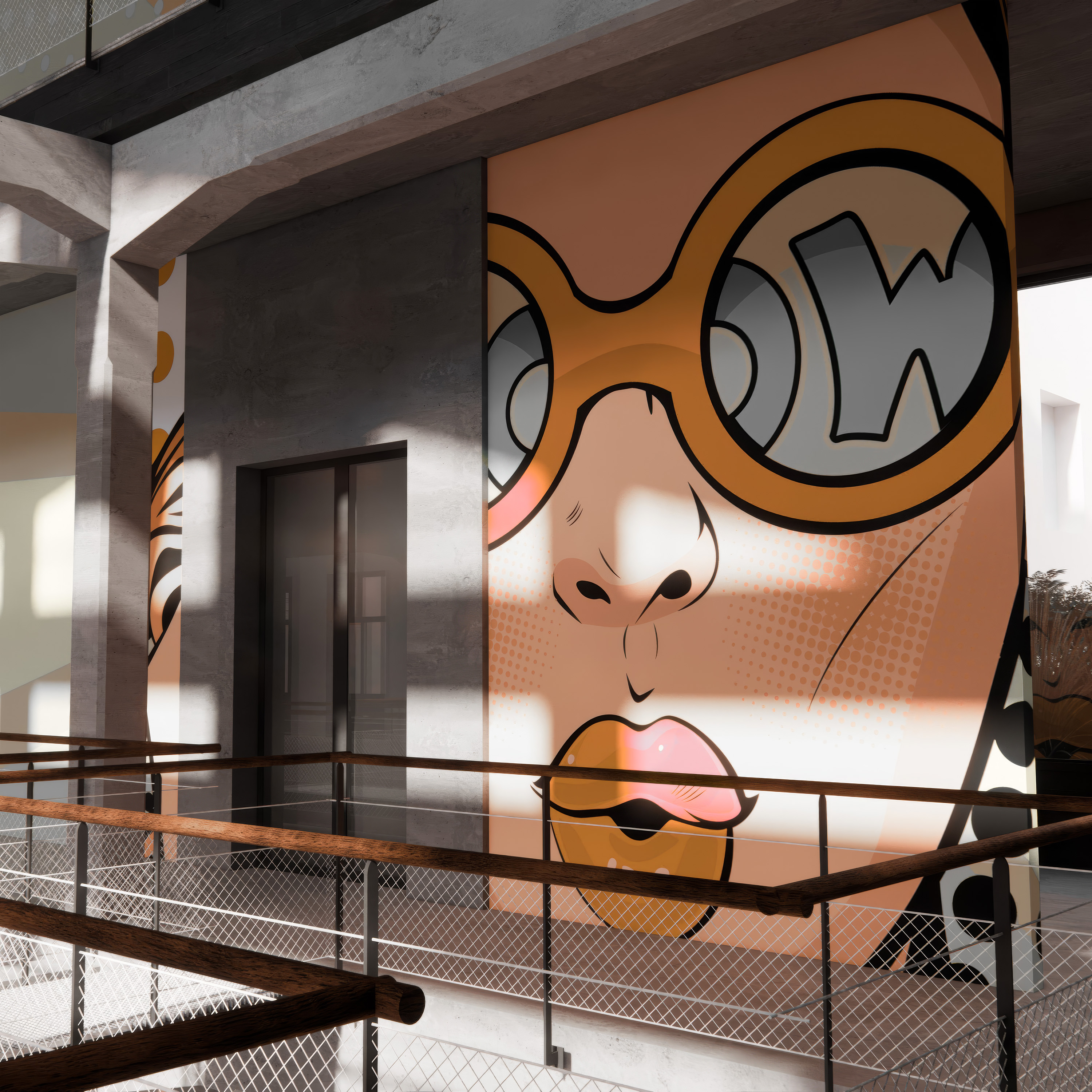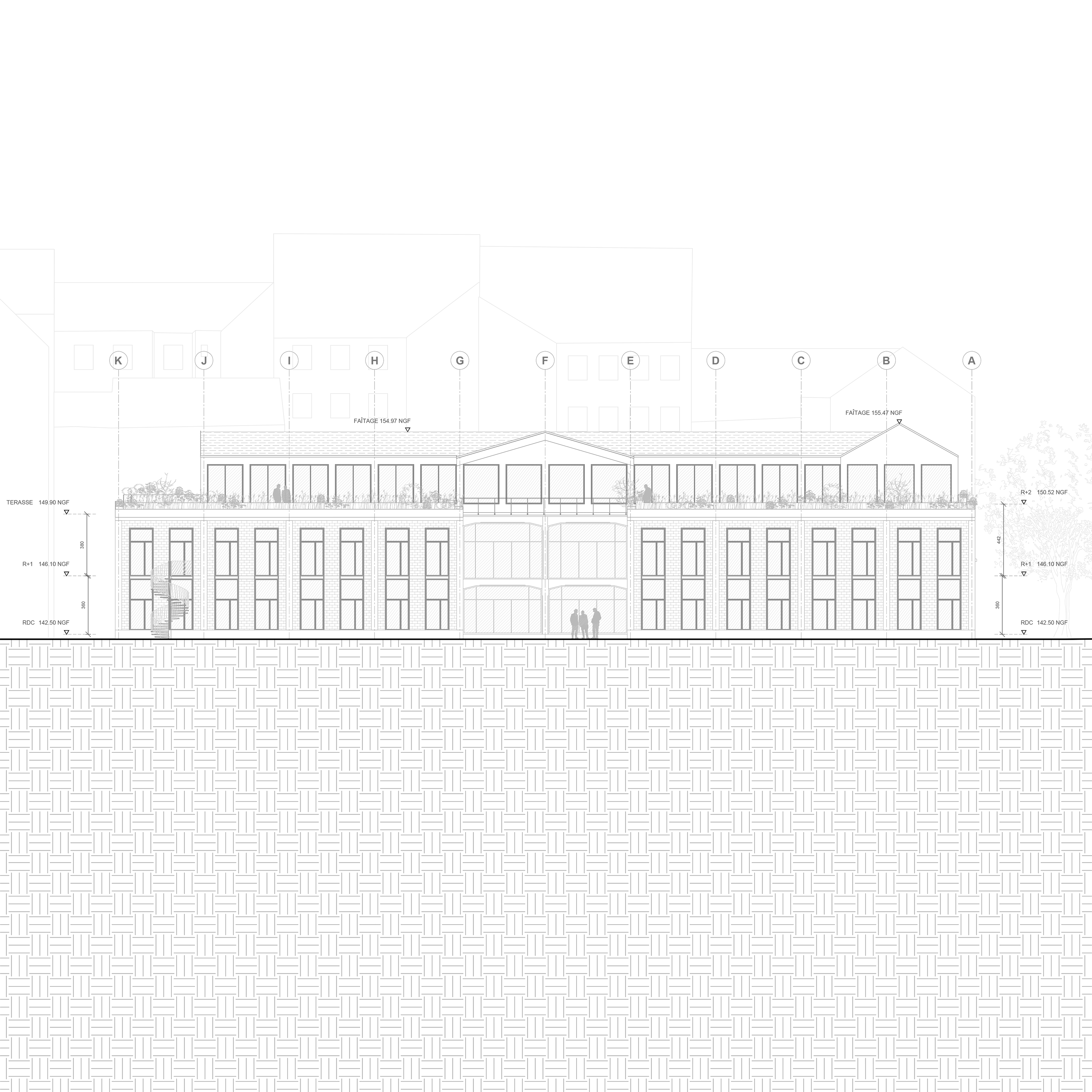En opposition, le renouveau du quartier et l'arrivée de plus en plus importante de jeunes étudiants à proximité nous a poussé à proposer une nouvelle vision du bâtiment en y ajoutant un étage complètement en bois en attique et en imposant une très grand fresque sur la hauteur afin de mettre en exergue ce renouveau.